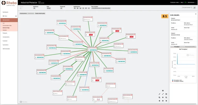 Fig. 2: Network map with detailed information and connection overview in Rhebo Industrial Protector